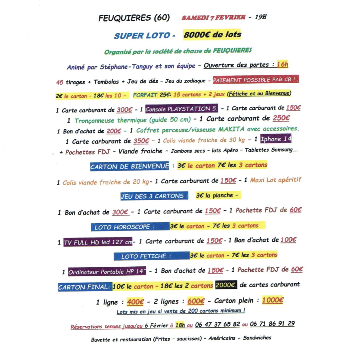 La société de chasse de Feuquières organise un SUPER LOTO le samedi 07 février 2026 à 19h00, salle polyvalente.