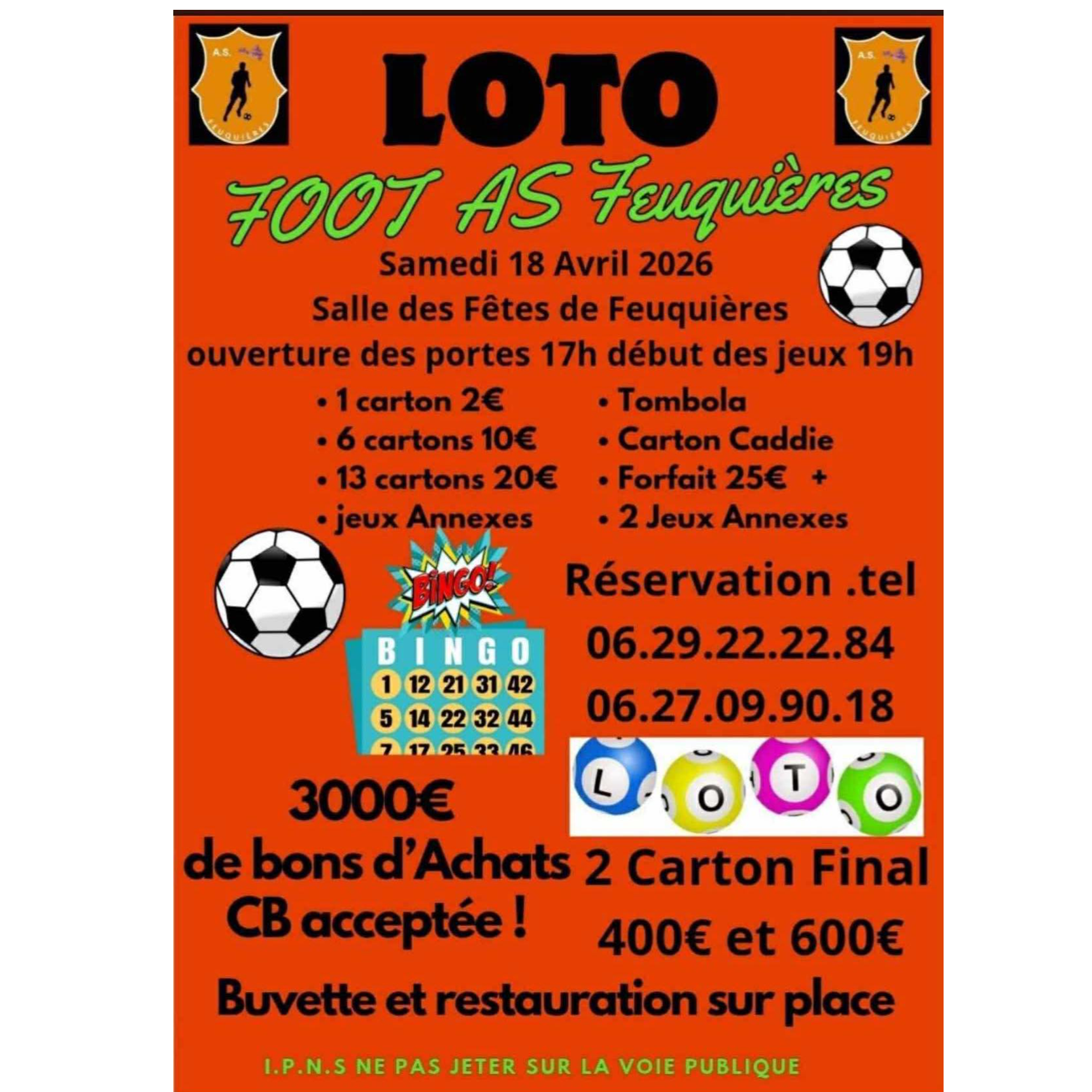 Foot As Feuquières organise un loto le samedi 18 avril 2026, salle polyvalent de Feuqières.