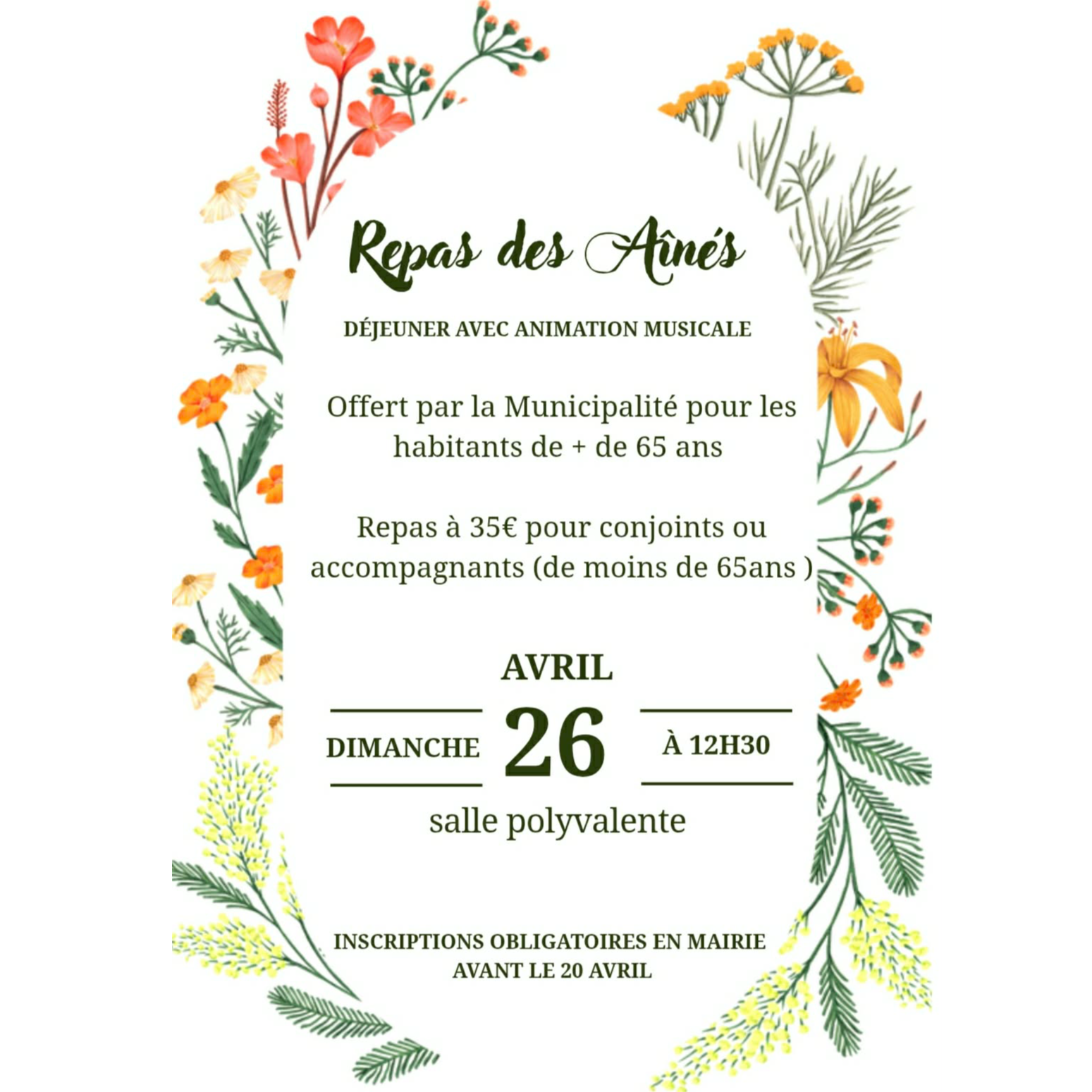Repas des Aînés, dimanche 26 avril 2026 à 12h30 à la salle polyvalente.