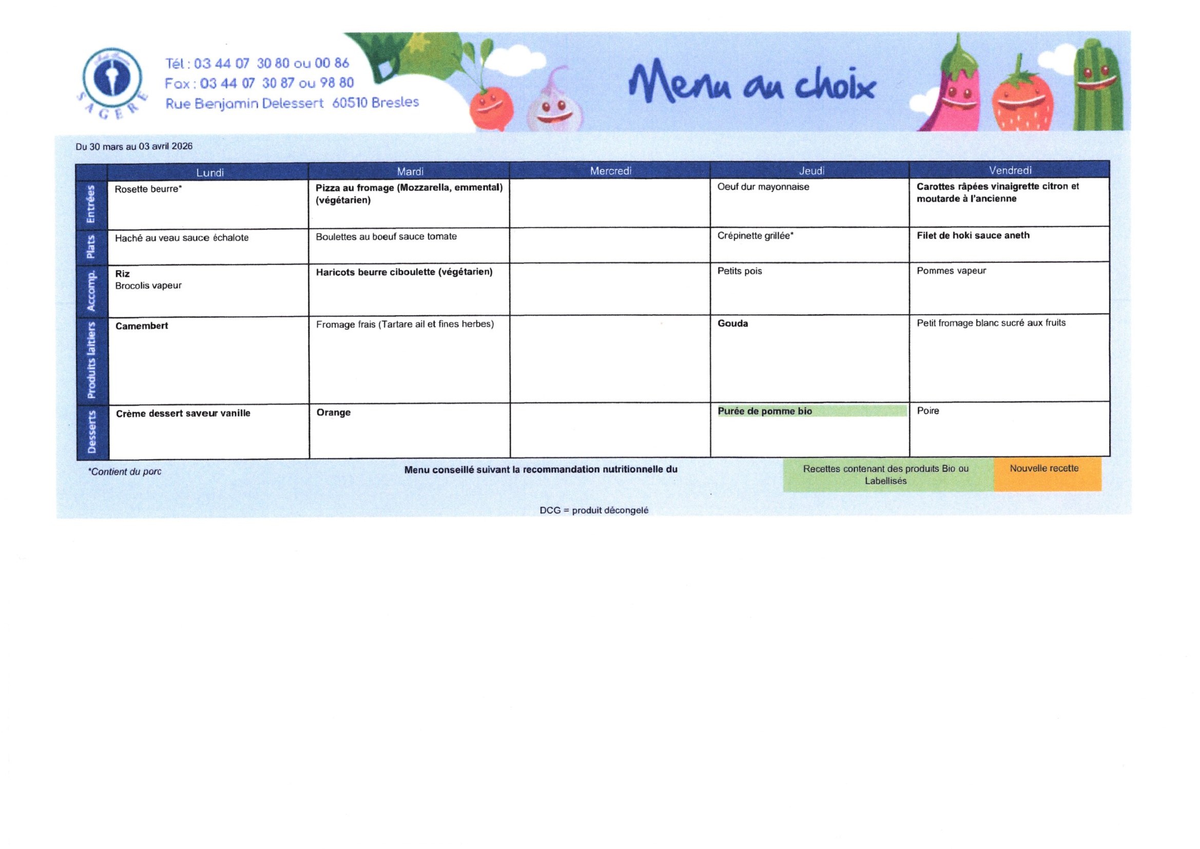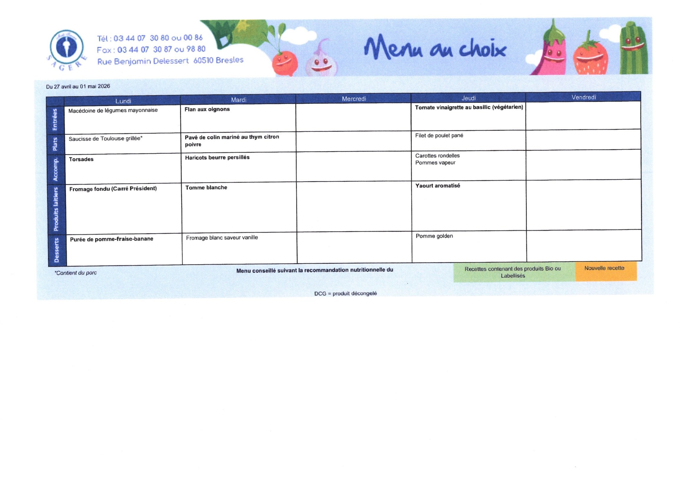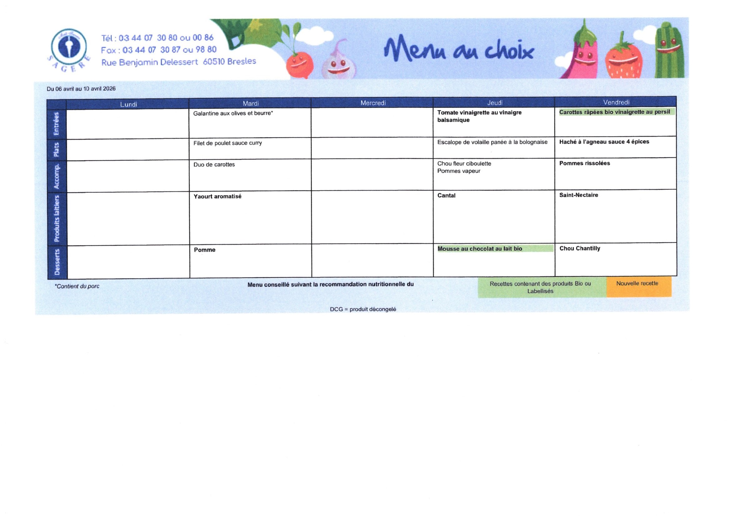 Retrouvez sur cette page les menus prévus pour la restauration scolaire de Feuquières. Nous travaillons avec notre prestataire Sagère pour la préparation et la composition des repas