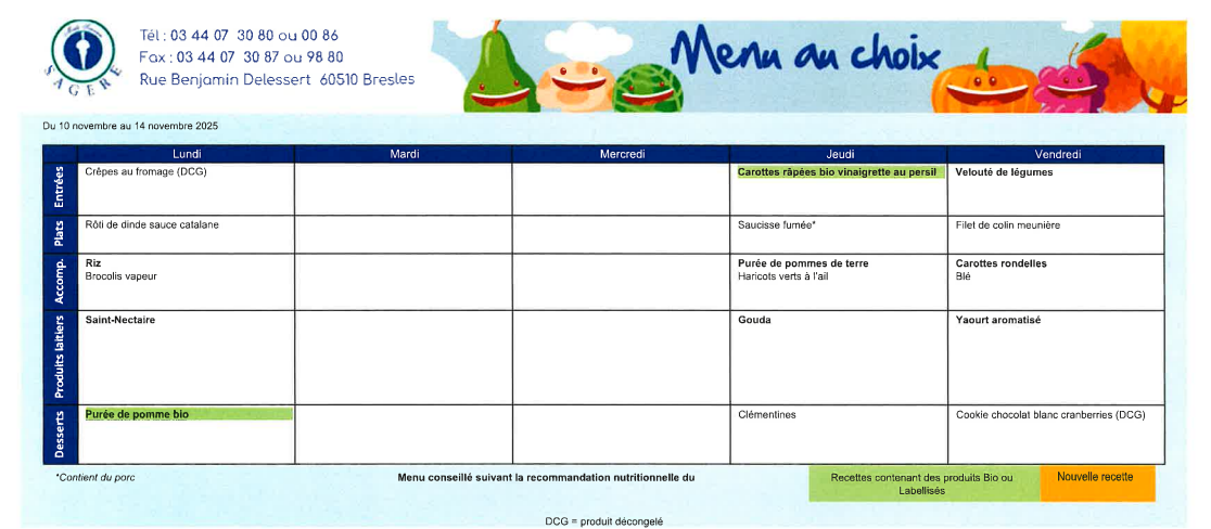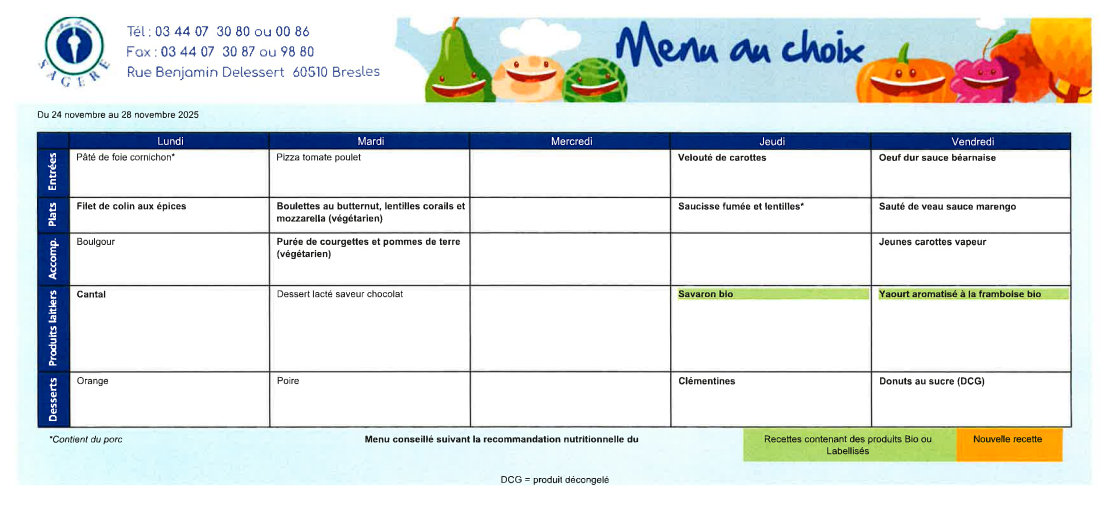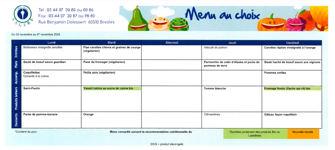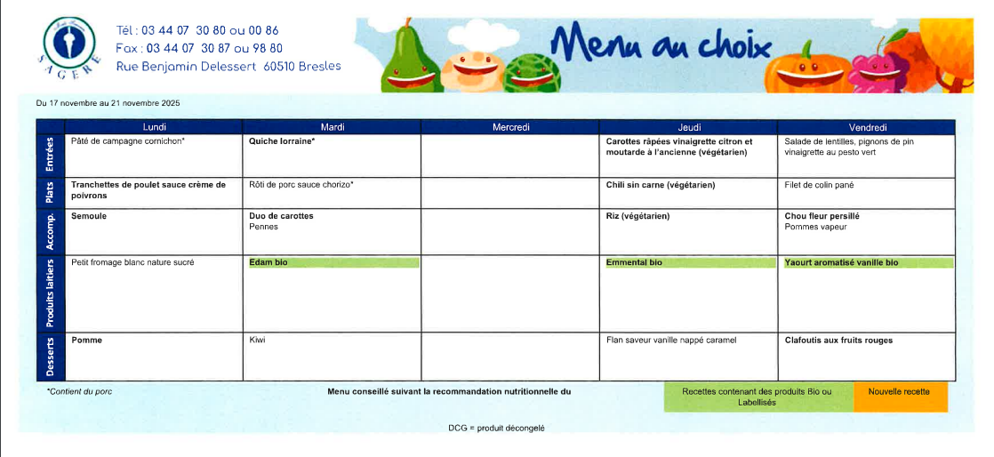 Retrouvez sur cette page les menus prévus pour la restauration scolaire de Feuquières. Nous travaillons avec notre prestataire Sagère pour la préparation et la composition des repas